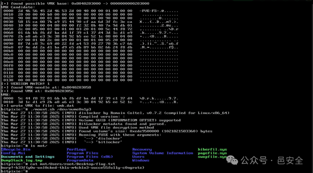 通过利用名为Bitpixie(CVE-2023-21563)的漏洞,红队成员与攻防安全专家能够从内存中提取BitLocker卷主密钥(VMK),在五分钟内完整解密受保护的Windows设备。Compass Security研究员Marc Tanner在红队评估报告中指出:”该漏洞利用过程具有非侵入性,既不需要永久性设备改造,也无需获取完整磁盘映像”。