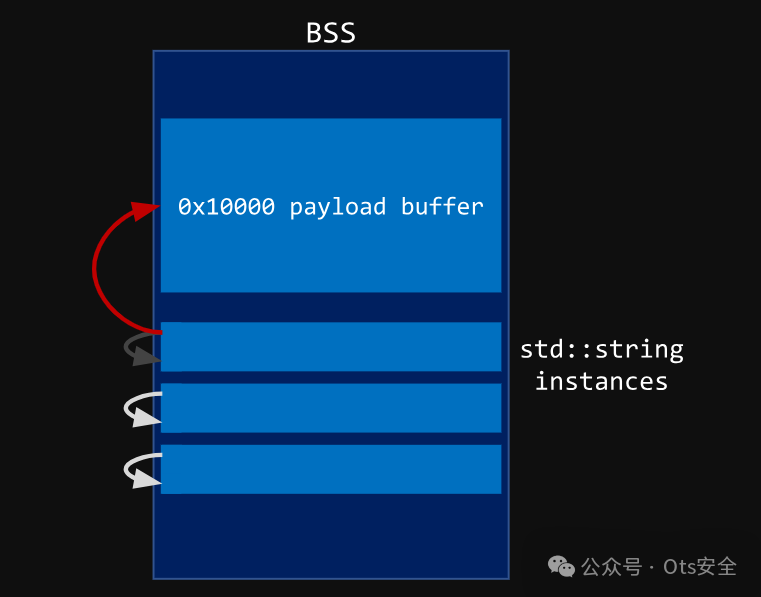这就带来了一个问题:有效载荷缓冲区之后是什么?有效载荷缓冲区是共享库 BSS 中全局变量中三个 0x10000 大小的缓冲区之一。除了少数几个具有以下结构的实例外,g_recvbuf全局变量并不多:std::string