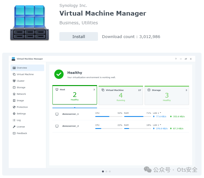 我们查看的第一个软件包是虚拟机管理器,它是直接从物理 DiskStation 上的内置软件包中心安装的。