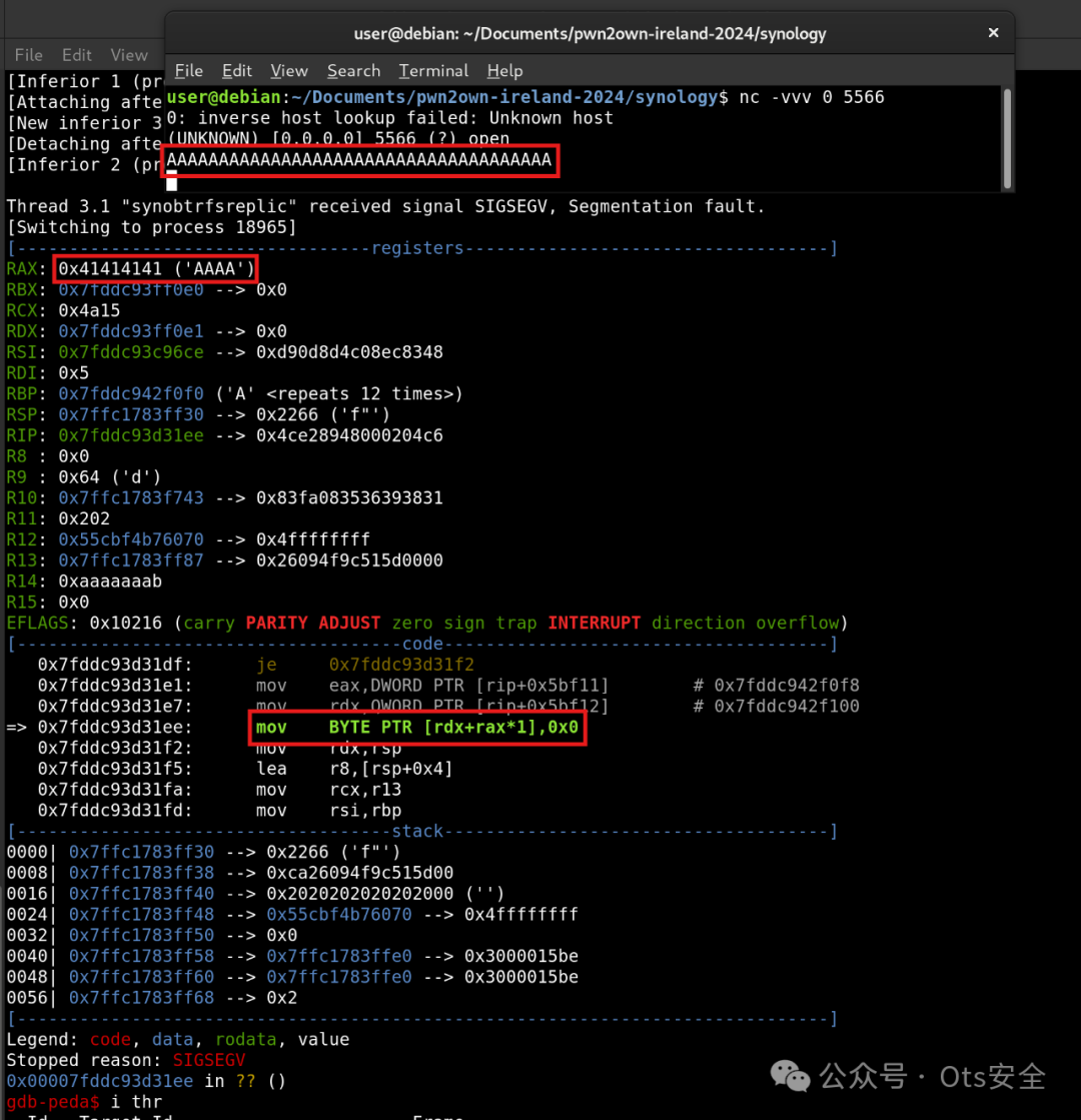 这个漏洞很简单,对于我们最初的 POC,我们可以使用 netcat 以经典的可破解方式发送仅由 A(至少 12 个)组成的消息: