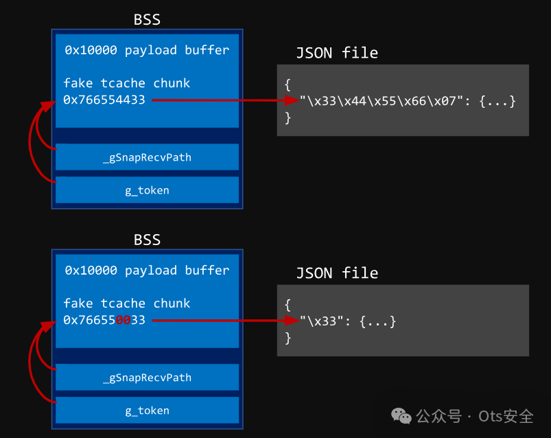 一旦伪造的块被释放,并且移位后的 BSS 指针被写入,我们就会将char*第二个全局变量的低 2 个字节置空std::string。g_token这种破坏会导致g_token指向与 完全相同的位置_gSnapRecvPath,也就是移位后的 BSS 指针。