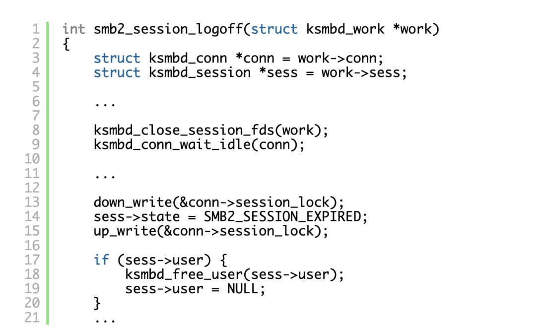 当一个ksmbd工作线程还在执行使用sess->user的请求时,另一个处理同一会话SMB2 LOGOFF的线程释放了该结构。没有同步机制保护该指针,所以第一个线程会解引用已释放的内存——这是一个经典的释放后使用漏洞,会导致内核内存损坏和任意代码执行。