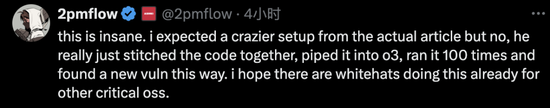 有网友看过发现过程后感叹,原以为会有很疯狂的实验设置,但其实只是把一堆代码缝到一起,让o3检查100次。
