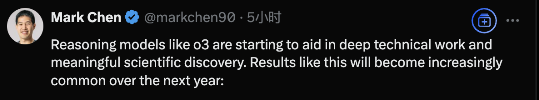 OpenAI首席研究官Mark Chen表示:像o3这样的推理模型正开始助力深度技术工作和有意义的科学发现。接下来一年,类似这样的成果将会越来越普遍: