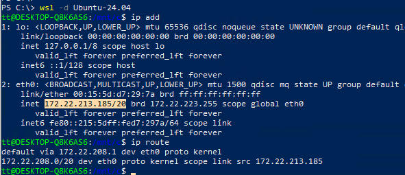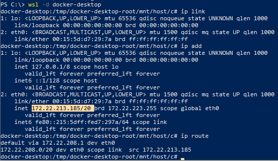 可以看到,虚拟机只有一张网卡,IP地址为172.22.213.185/20,网关是172.22.208.1,也就是系统中备注为WSL的vEthernet网卡。但是,没有看到docker0那张桥接网卡。