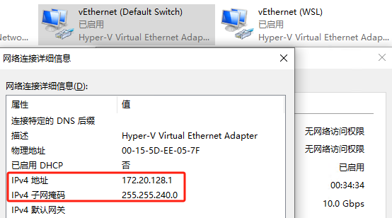 那就还剩下两张vEthernet网卡。一张备注为Default Switch,应该是Hyper-V的虚拟交换机绑定的网卡