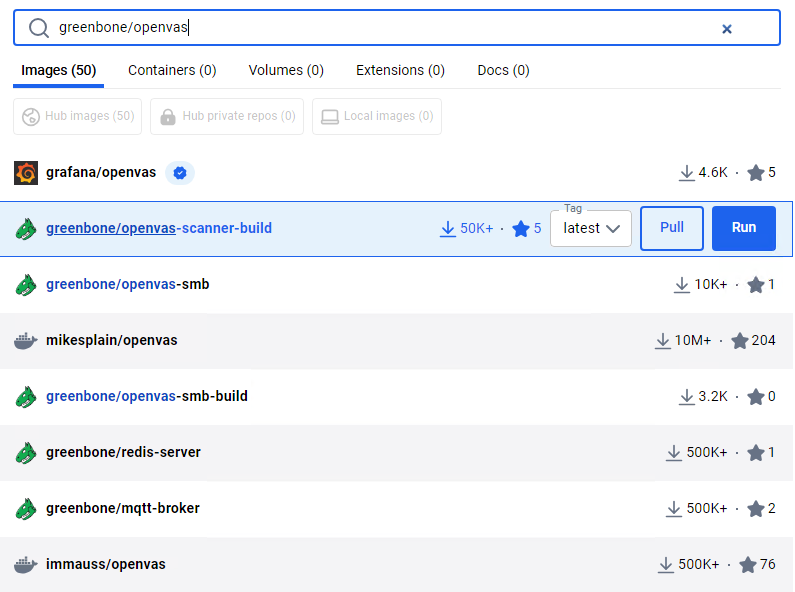 搜索结果一大堆,下载量破千万的mikesplain/openvas竟然不是第一个,而OpenVAS的官方是Greenbone,竟然没有出现在搜索结果里面。我们换成greenbone/openvas试一下。