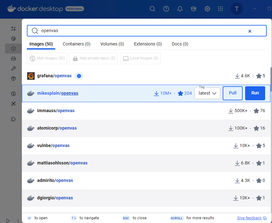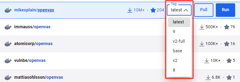 如果是简单测试的话,我们先试一下mikesplain/openvas吧,可以通过标签选择镜像版本,初次使用,就选latest吧。点击【Pull】下载镜像,或者直接点击【Run】运行容器。