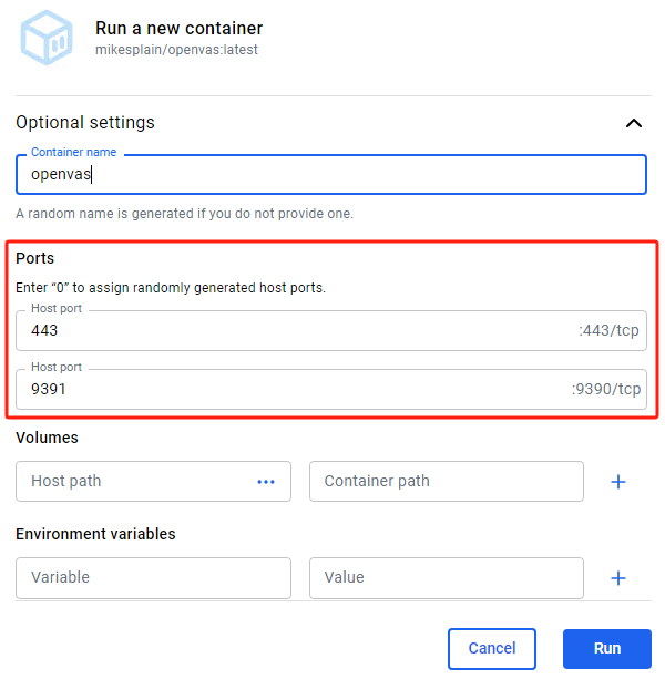 意外的是,最新版本是6年前的,失敬失敬。点击运行按钮之后,在端口这里,我们需要将容器使用的TCP端口443和9390两个端口映射出来,要不然无法访问。