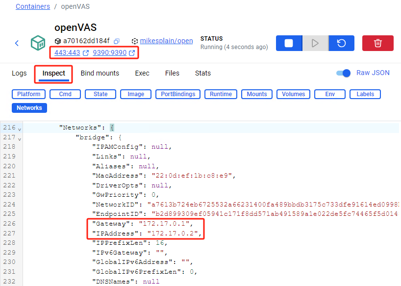 容器运行之后,我们可以在Inspect一栏查看容器的详细信息()。