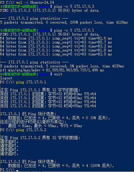 从虚拟机里面到172.17.0.2不通,但是到172.17.0.1能通,TTL为63,说明还不是直连的。回到宿主机看一下,发现到172.17.0.1的TTL为64,说明是直连的,但是我没有找到这个网卡。到172.17.0.2不通,应该是容器的安全策略问题了。