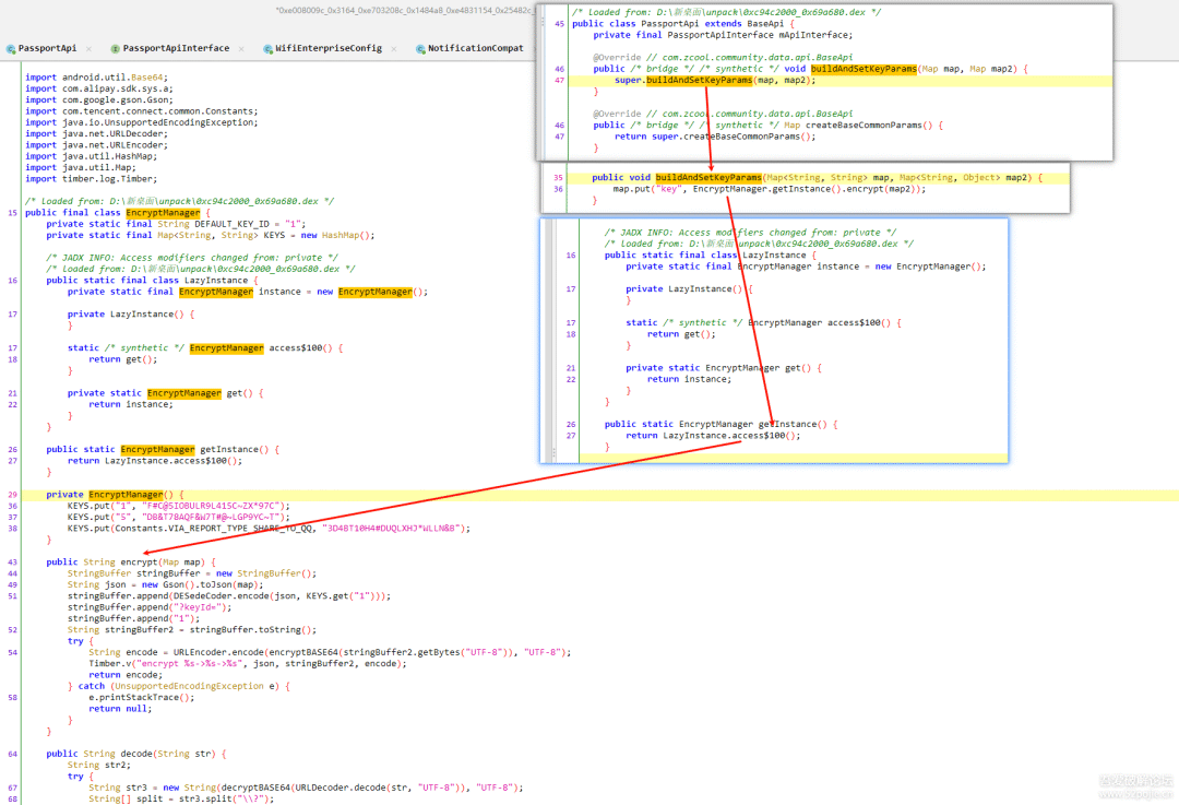 绕了一圈,创建了一个EncryptManager 类 调用这个类的 encrypt 方法,传入map2,map是空的,map2包含用户的各种信息。hook一下这个方法,查看出入值,返回值和抓包的值是否有一致的部分