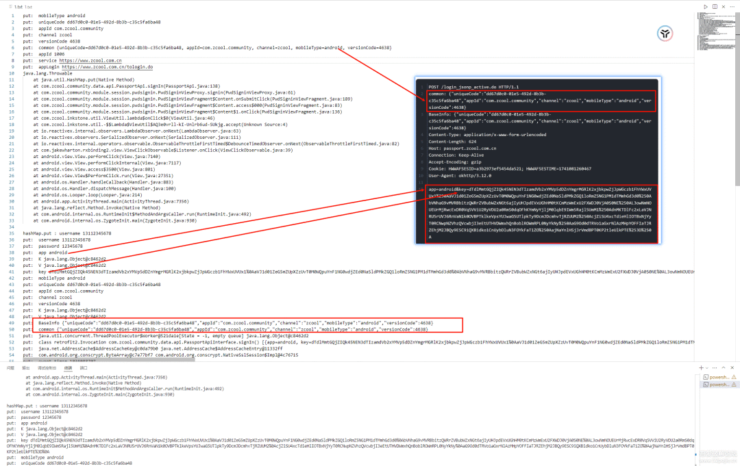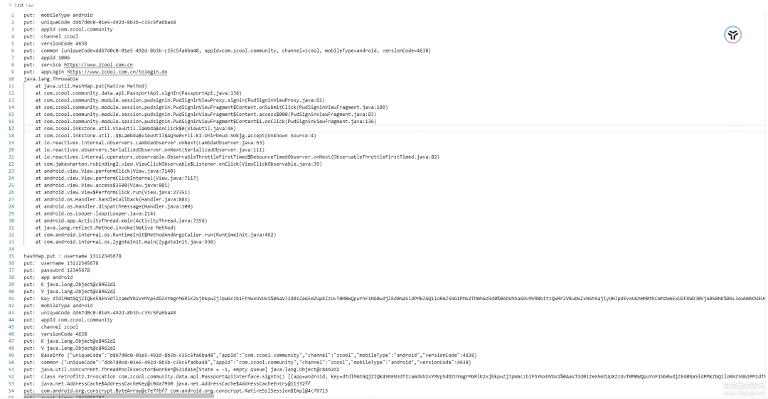 看那么长的数据先从 hashmap下手,hook hashmap,因为是登录逻辑,可以打印一下username或者password的字段堆栈