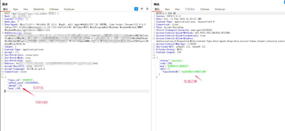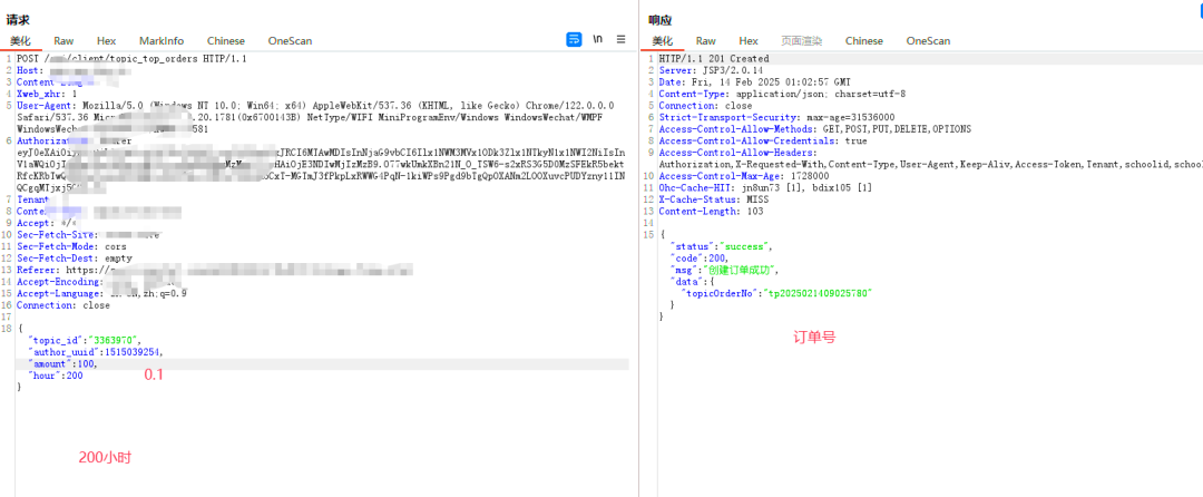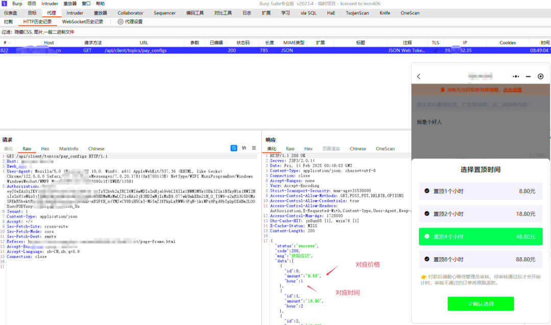 正常走发布帖子的流程,记录所有接口 这个接口数据包回显了对应的价格字段 并且没有对应的sing或者加密一类的东西和后端做校验,等于是前端校验价格还有置顶的时间,然后后端就返回了生成订单,那么我们篡改价格并且拉成时间就造成了漏洞问题了 /api/client/topic_top_orders