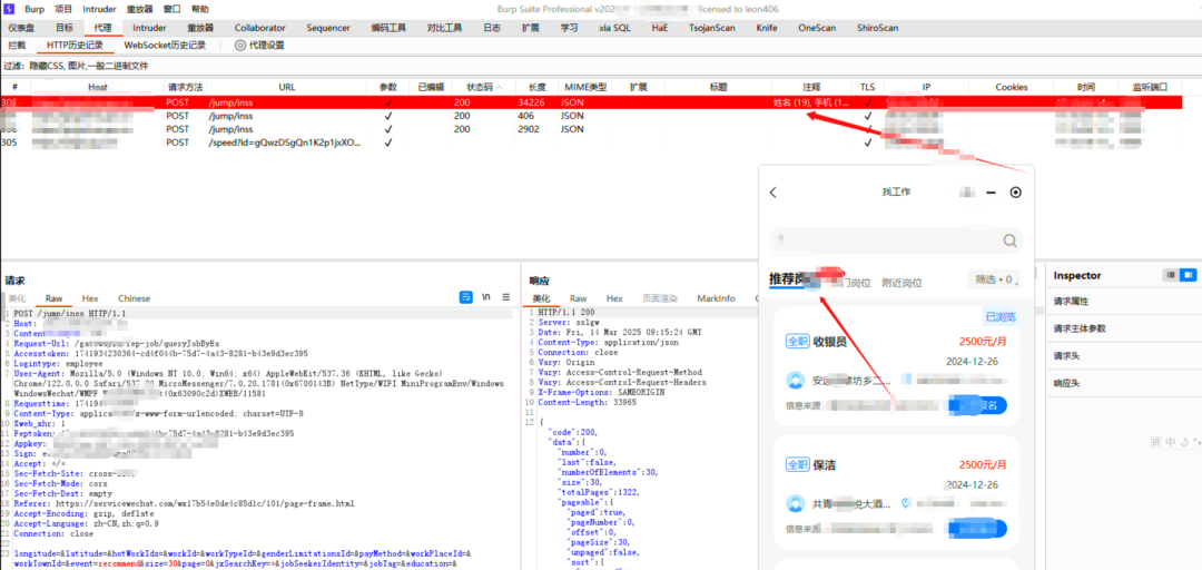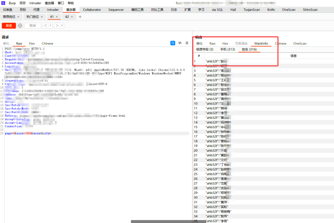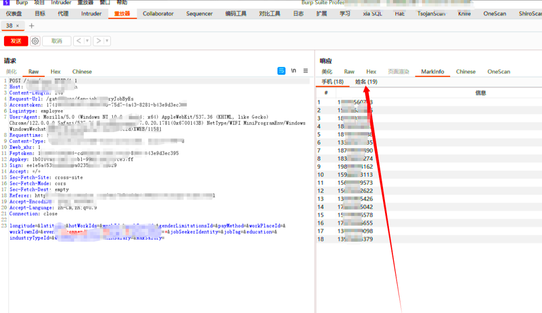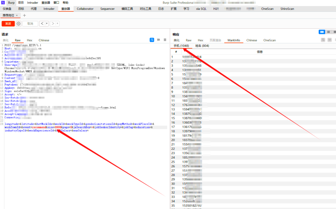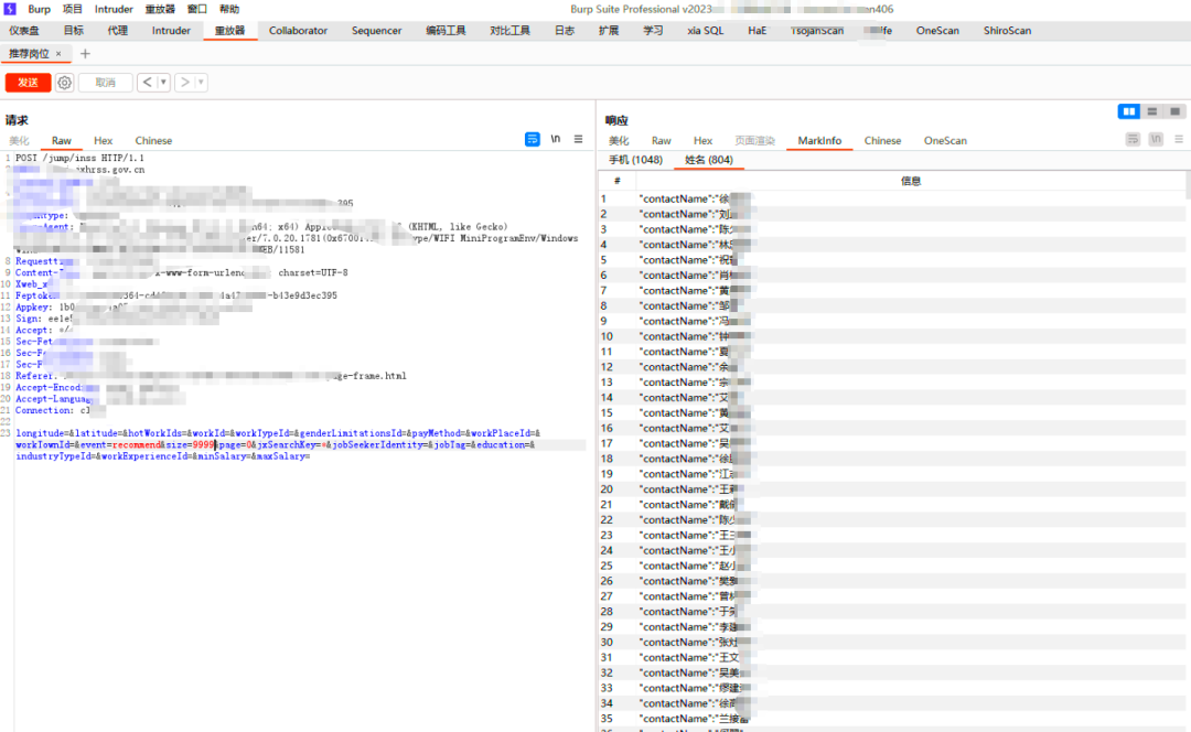 其他功能点均存在此问题,大部分都是页面只能看到企业联系人姓名,打电话联系也是虚拟号码,但是在响应体中确会显示所有的手机号码和姓名,小程序业务也是求职里面包含大量的公司企业,通过响应包缺陷+模糊查询*+size字节+Hae神器匹配整站企业联系人二要素全部泄露,并未全部列出但目测2w+条