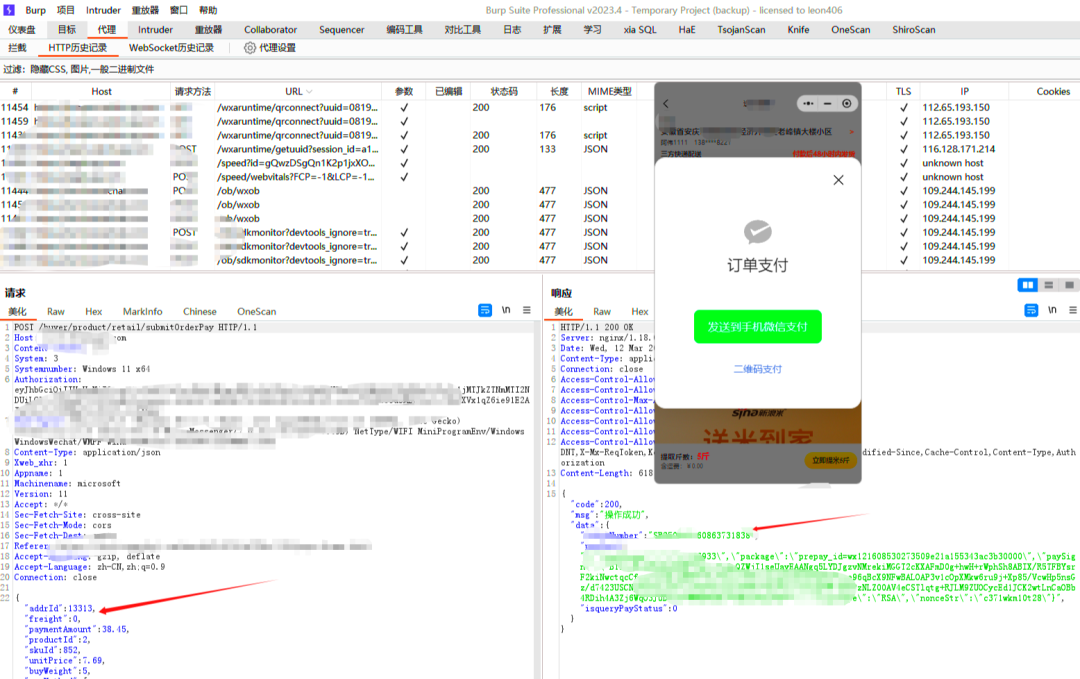 知晓了业务流程后续就是BP抓取生成订单的数据包 api/client/topic_top_orders 进行拦截篡改操作 价格改小就可以完成0元购,点击付费 就会拦截数据包修改价格然后一直放行就行了出现付款的选择 选择二维码支付 扫描付款就行了