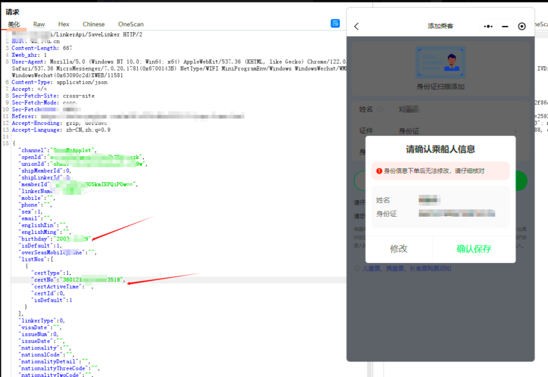 但是这里不能直接通过上面的手法修改类型、价格, 测试发现决定是否免费的关键是身份证的处理,身份证需要是儿童的出生年月,但是添加乘客接口是身份证大多是实名认证,我不清楚验证的原理是什么,按道理前端了身份证号对应的身份证,说明是后端查询到了, 但是我在BP里面拦截这个数据包又可以修改,说明并没有走后端,那么一开始的前端验证是什么逻辑呢,有懂的师傅可以解释一下,难道身份证认证的接口放到前端查询吗,可能是调用了身份证的接口