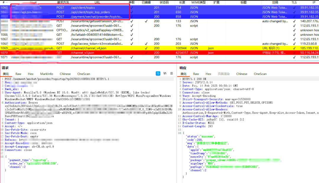 /api/client/topics  帖子内容文字和标签/api/client/topic_top_orders  置顶的价格生成订单号 这里进行篡改payment/wechat/preorder/topictop/tp2025021408581339  请求后端付款