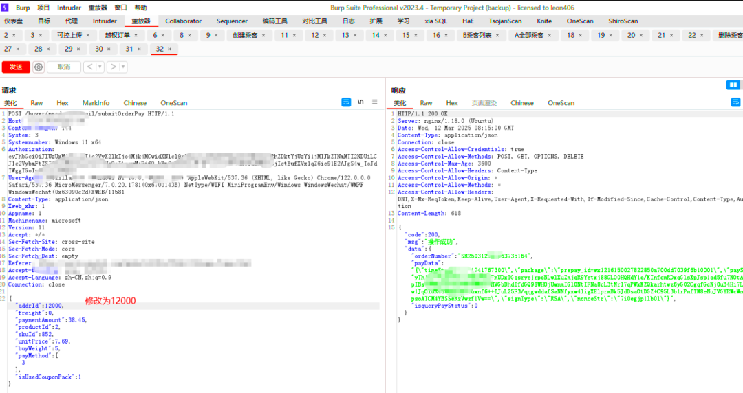 这两个字段都是鉴权字段,有了此字段的就可以跟替换Cookie一样替换别人的身份其他人的,操作此小程序所有增删改查功能点,当前虽然开着Hae但并没有相关的规则字段正则所以匹配不到,真的是细心才能发现,如果这个订单接口可以继续利用遍历的话,再结合返回的这两个字段,整个小程序用户信息全部会被接管,所有乘客三要素包括小程序所有功能点