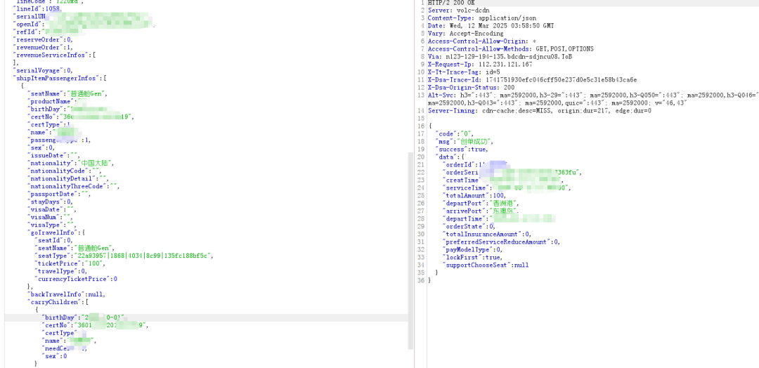 虽然无法利用,但是这个接口引发了另一种思考,订单号查询正常只返回订单对应乘客信息,但是这里却返回了用户的凭证字段