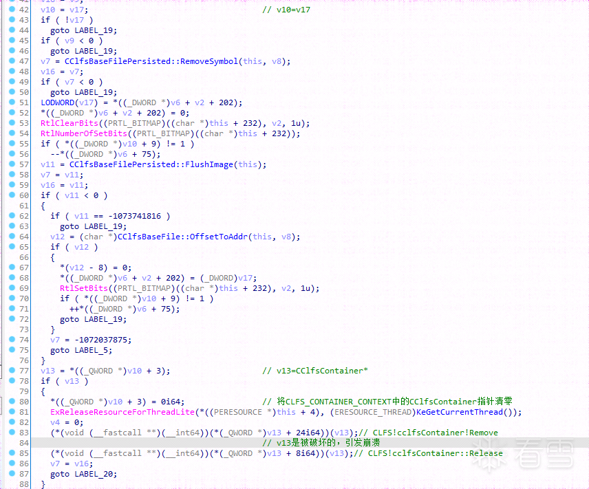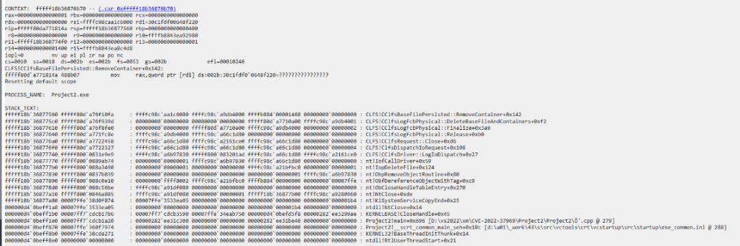 最后,在CLFS!CClfsBaseFilePersisted::RemoveContainer中取消引用指向CClfsContainter对象的损坏指针会导致内存冲突,造成崩溃。