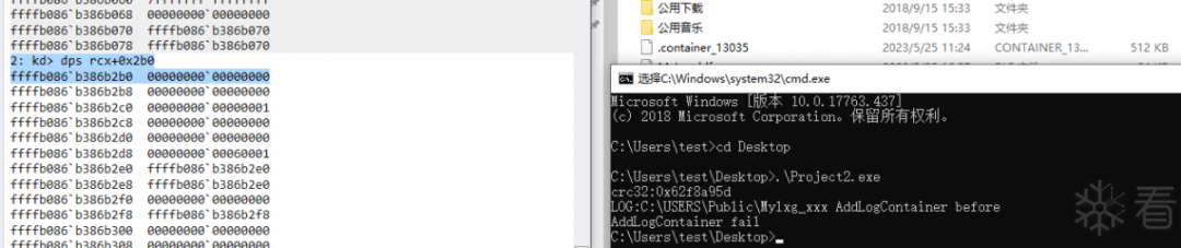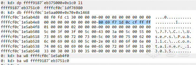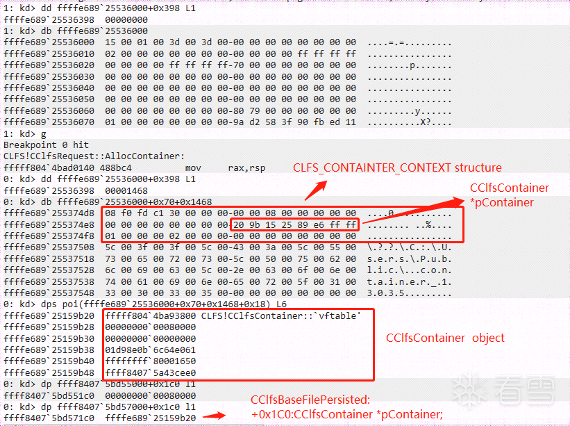 继续运行代码。将命中内存写入断点CLFS_CONTAINER_CONTEXT: +0x18。