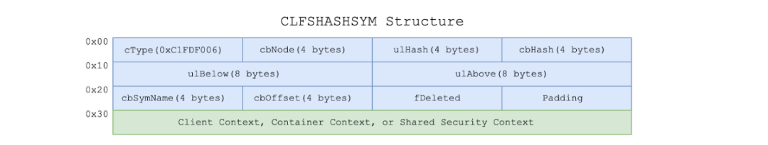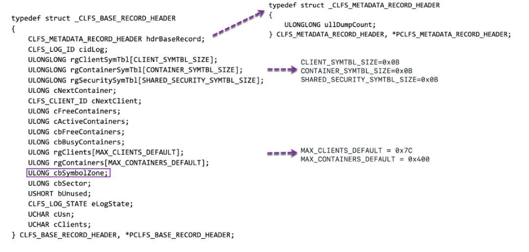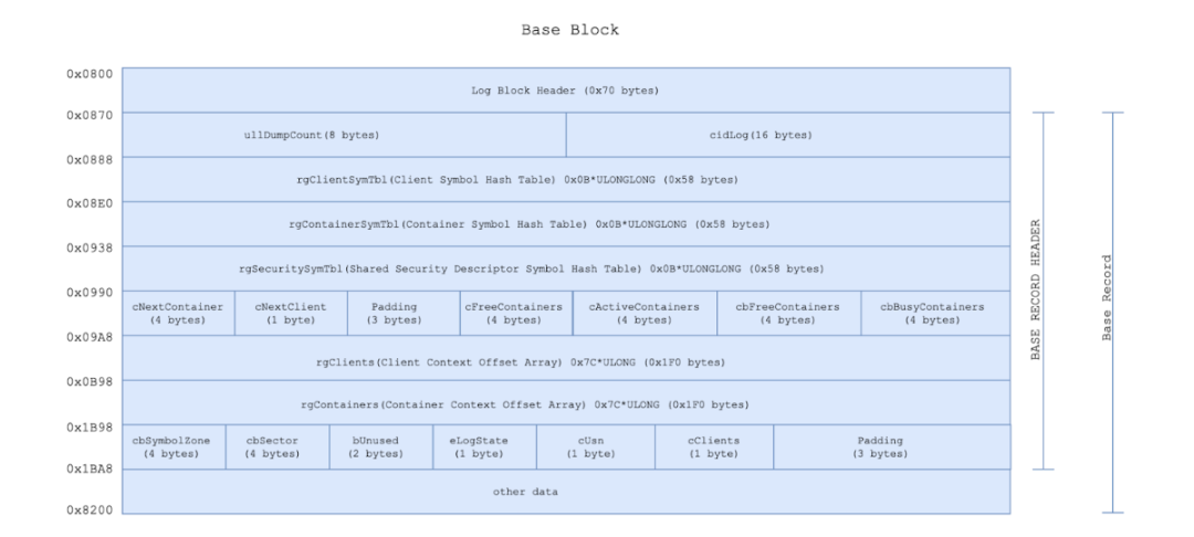 rgContainers表示指向容器上下文对象的偏移数组。cbSymbolZone表示符号区域中新符号的下一个可用偏移量。在Base Record中 Client Context, Container Context, 和Shared Security Context 用符号表示,他们前面是CLFSHASHSYM。