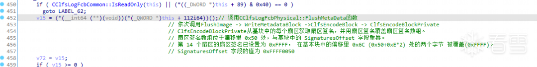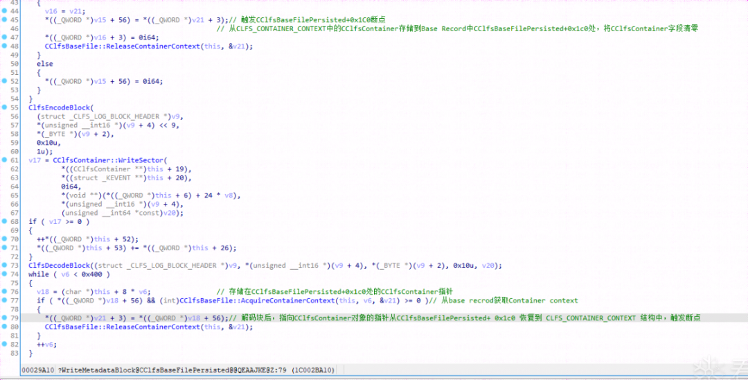 当在用户空间调用CloseHandle函数时, CClfsRequest::Close(PIRP Irp)处理这个请求。在内核中,另一个内存断点 (0x1c0+CClfsBaseFilePersisted) 在ClfsBaseFilePersisted::WriteMetadataBlock函数中命中。