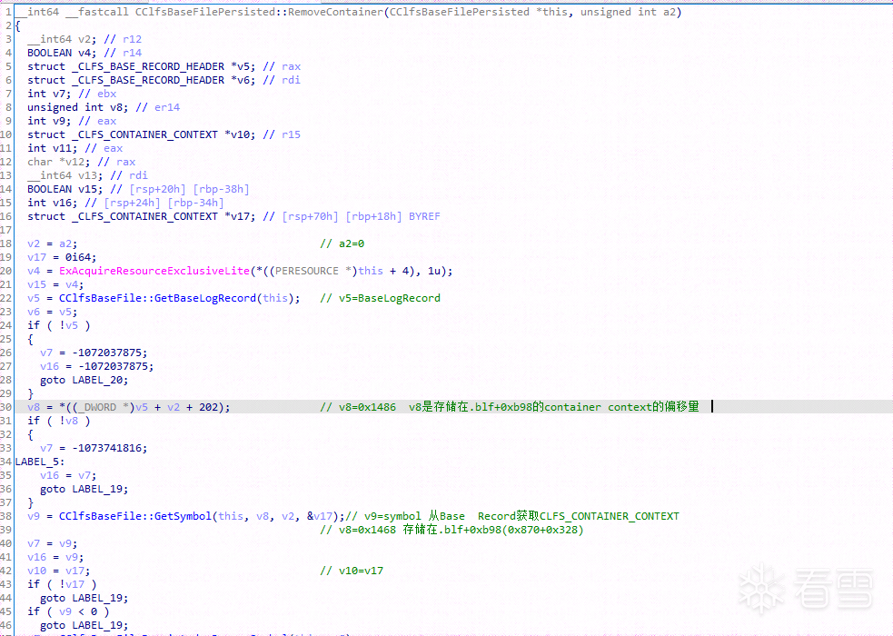 3.将步骤2中获取的CLFS_CONTAINER_CONTEXT结构中指向CClfsContainter对象的指针的值赋给局部变量v13。