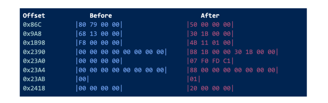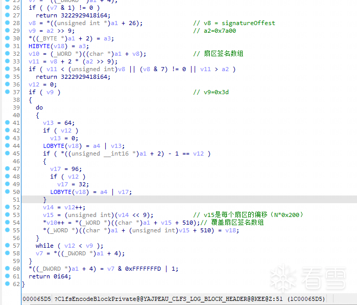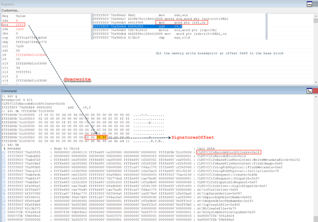 ClfsEncodeBlockPrivate从基块中的每个扇区获取扇区签名,并用扇区签名覆盖扇区签名数组,扇区签名数组位于偏移 0x50 处,与基块中的 SignaturesOffset 字段重叠。第 14 个扇区的扇区签名已设置为 0xFFFF, 在基本块中的偏移量 0x6C (0x50+0xE*2) 处的两个字节被覆盖(0xFFFF)。