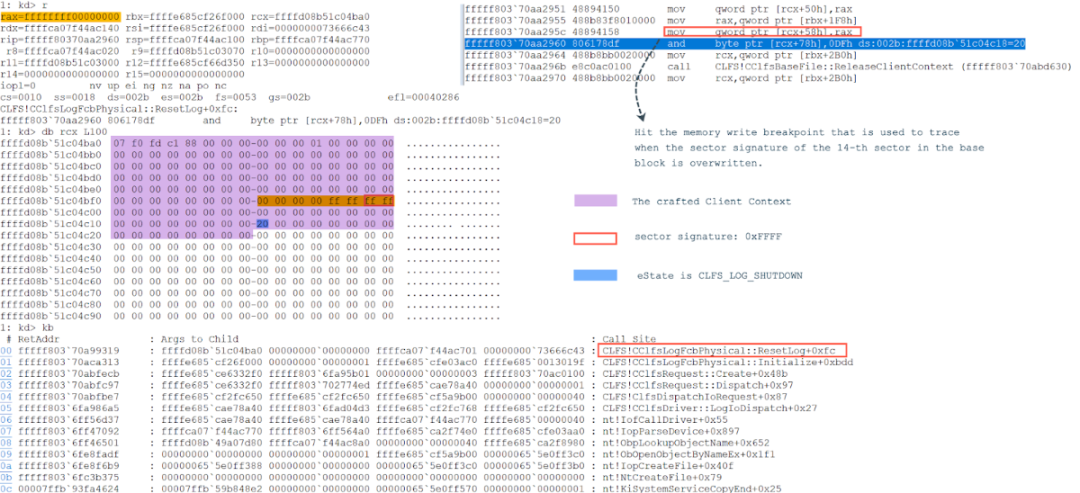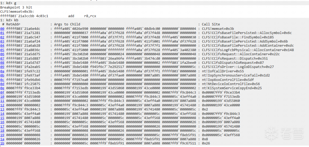 此时可以在CLFS_CONTAINER_CONTEXT+0x18处设置内存写断点,跟踪CLFS_CONTAINER_CONTEXT结构中CClfsContainer对象的指针何时损坏。CClfsBaseFilePersisted 对象中偏移量 0x1C0 处的另一个内存写入断点可以设置如下:1: kd> ba w8 ffffe689 255374f0 //CLFS_CONTAINER_CONTEXT+0x181: kd> ba w8 ffffe689 25159b20 //CClfsBaseFilePersisted+0x1C0到第七步给Mylog AllocContainer时