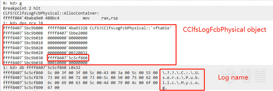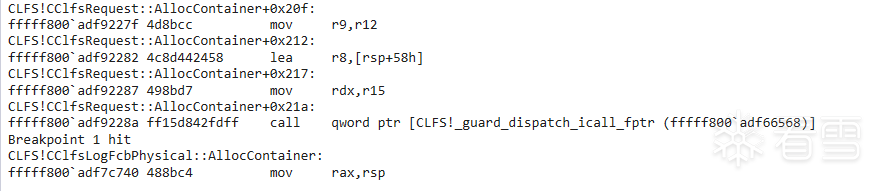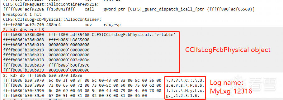 bu CLFS!CClfsLogFcbPhysical::AllocContainer断点被触发,rcx存放的是CClfsLogFcbPhysical类的this指针。