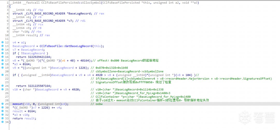 CClfsBaseFilePersisted::AllocSymbol函数中调用memset函数触发内存写断点,Base Record 中的CLFS_CONTAINER_CONTEXT产生越界写入,这会导致CClfsContainer对象中的指针损坏。