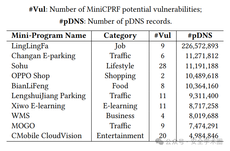 通过分析七天内 3,208 个微信小程序及其 9,007 个关联域名的 pDNS 记录,发现许多易受攻击的小程序拥有较高的访问量。下表展示了按 pDNS 记录计数排名的前 10 个小程序: