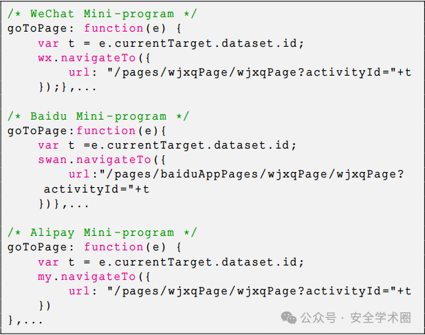 此外,通过分析多平台同名小程序发现:企业微信有 49/49(100%)、百度有 47/49(95.9%)、支付宝有 20/23(87.0%)和抖音有 12/17(71.5%)的小程序均表现出与微信相似的漏洞模式。产生不一致结果的原因是路由前缀不同,表明该漏洞具有跨平台普遍性。下图展示了问卷星小程序在不同平台上参数和目标页面的的相似性: