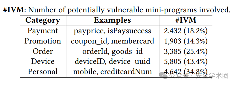 研究者将与潜在漏洞相关的参数分为五类:支付信息、促销信息、订单信息、设备信息、个人信息。该实验从每个类别中随机选择 80 个小程序,MiniCAT 在 316(79.0%) 个小程序中检测到严重的安全问题,其中又有 234 个小程序存在敏感信息泄露,82 个小程序可以执行越权敏感操作。下表展示了 13,349 个易受攻击小程序的分类结果: