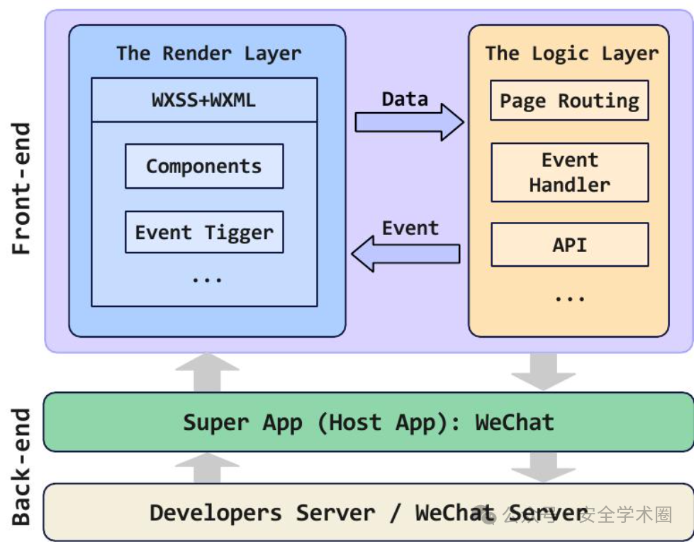下图展示了微信小程序的架构以及其如何在渲染层和逻辑层之间实现通信。用户操作通过事件从渲染层传输到逻辑层,以便超级应用程序进行进一步处理。当渲染层活动触发事件时,逻辑层将执行事件处理函数。