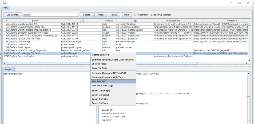 用这个工具搜索PoC的时候,它会自动扫描nuclei – templates目录下的所有PoC文件,然后加载进程序,我们可以通过关键词搜索来找到自己想要的PoC。要是想生成PoC命令,选中想要的PoC,右键选择“generate Command Of This PoC”,命令就会写入剪切板,直接粘贴运行就行。这样的好处是可以对命令行进行再次编辑,不过得自己粘贴后运行。