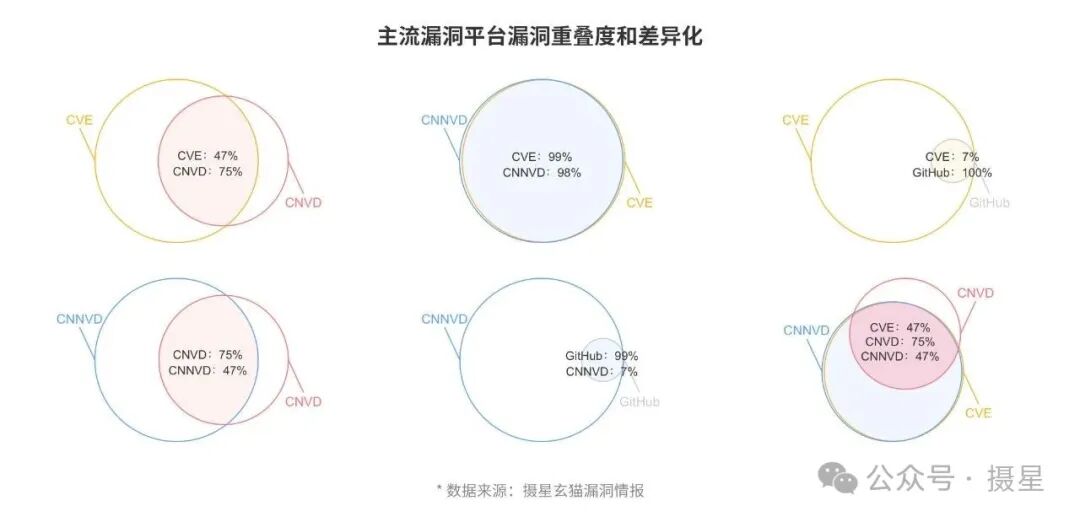 主流漏洞的重叠度竟然不到50%。而这种差异性正在给依赖单一漏洞平台的用户造成认知“盲区”。