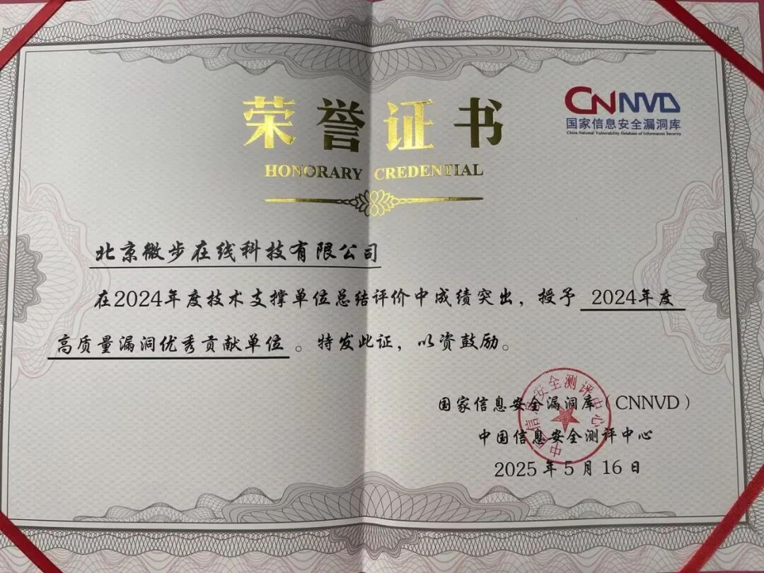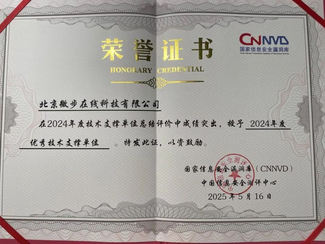 近日,国家信息安全漏洞库(CNNVD)发布2024年度评选结果,微步凭借在漏洞挖掘、分析及响应领域的持续积极参与,连续三年蝉联“年度优秀技术支撑单位”与“高质量漏洞优秀贡献单位”两项荣誉。
