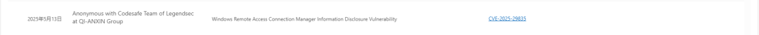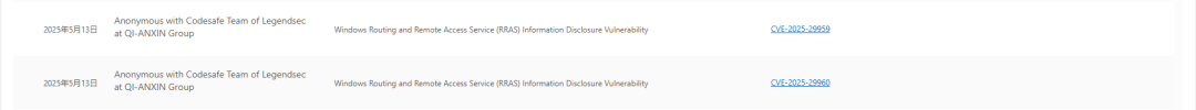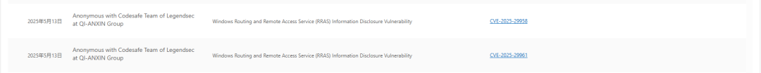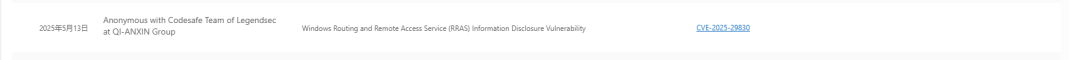 其中,Windows 路由和远程访问服务(RRAS)信息泄露漏洞(CVE-2025-29959)、Windows 路由和远程访问服务(RRAS)信息泄露漏洞(CVE-2025-29960)、Windows 路由和远程访问服务(RRAS)信息泄露漏洞(CVE-2025-29830)、Windows 路由和远程访问服务(RRAS)信息泄露漏洞(CVE-2025-29832)、Windows 路由和远程访问服务(RRAS)信息泄露漏洞(CVE-2025-29958)、Windows 路由和远程访问服务(RRAS)信息泄露漏洞(CVE-2025-29961)、Windows 远程访问连接管理器信息泄露漏洞(CVE-2025-29835)由奇安信代码安全实验室安全研究员发现并提交。