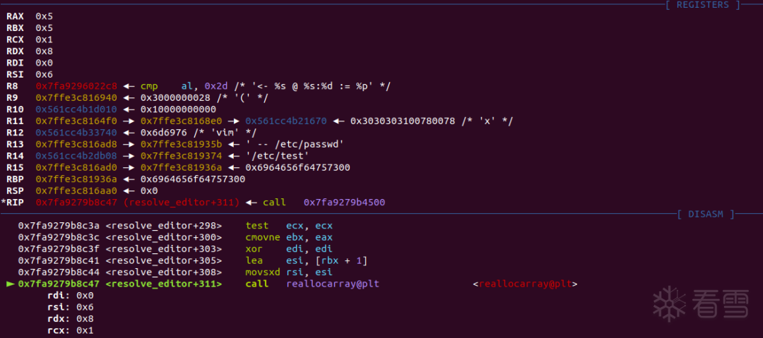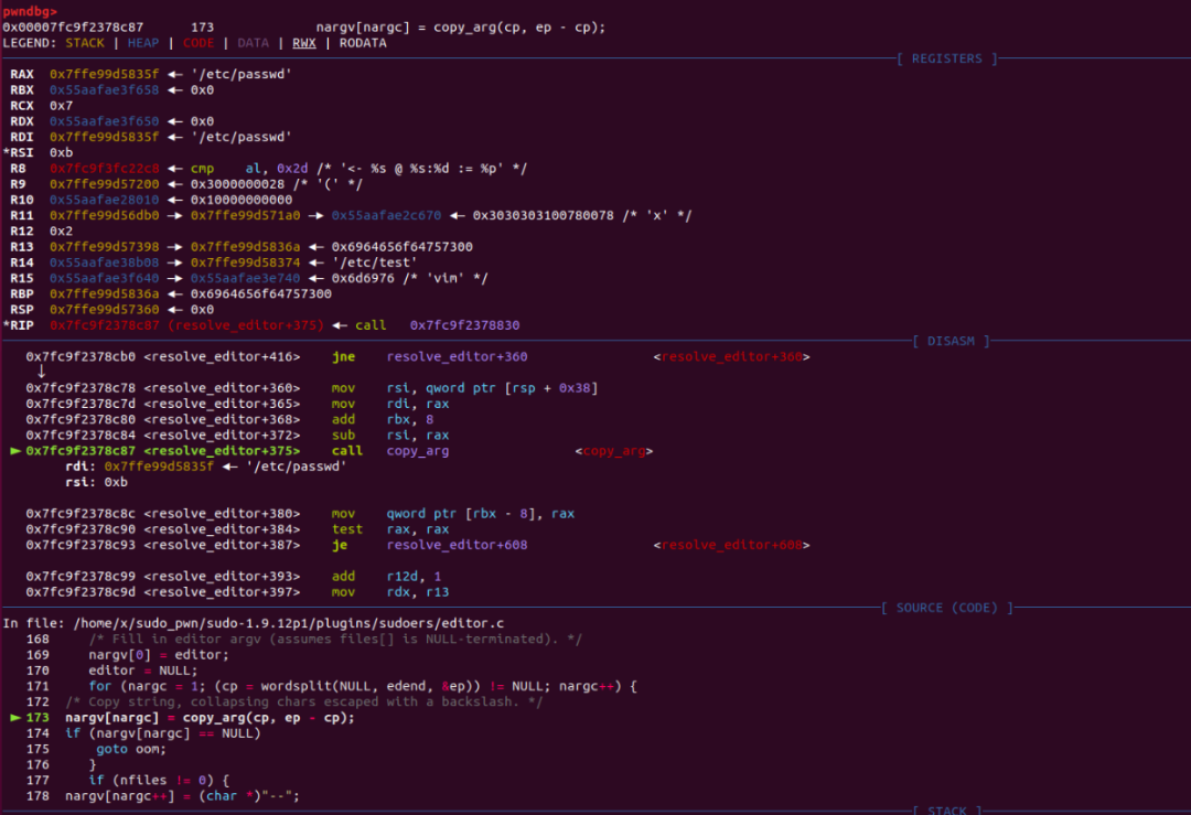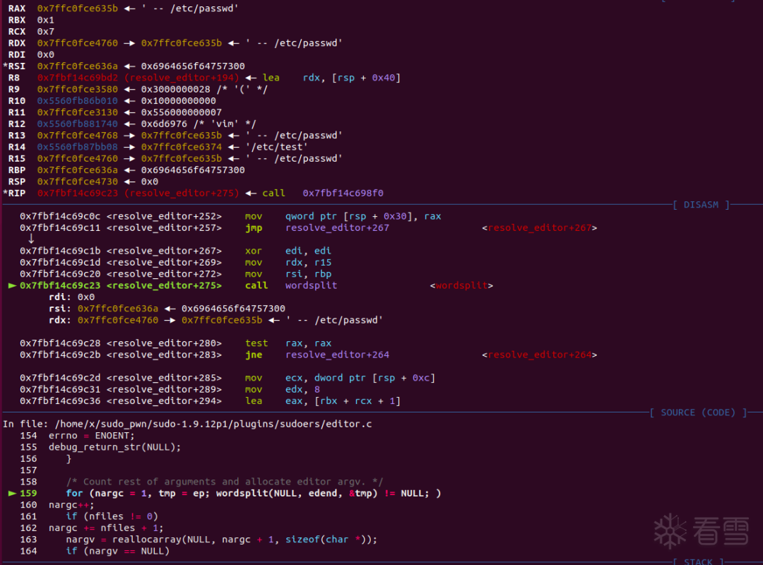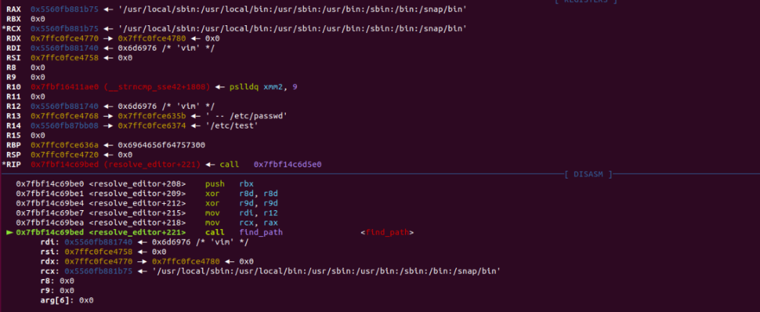 通过调试,可以看到此时环境变量EDITOR已经被我们注入为’vim — /etc/passwd’。