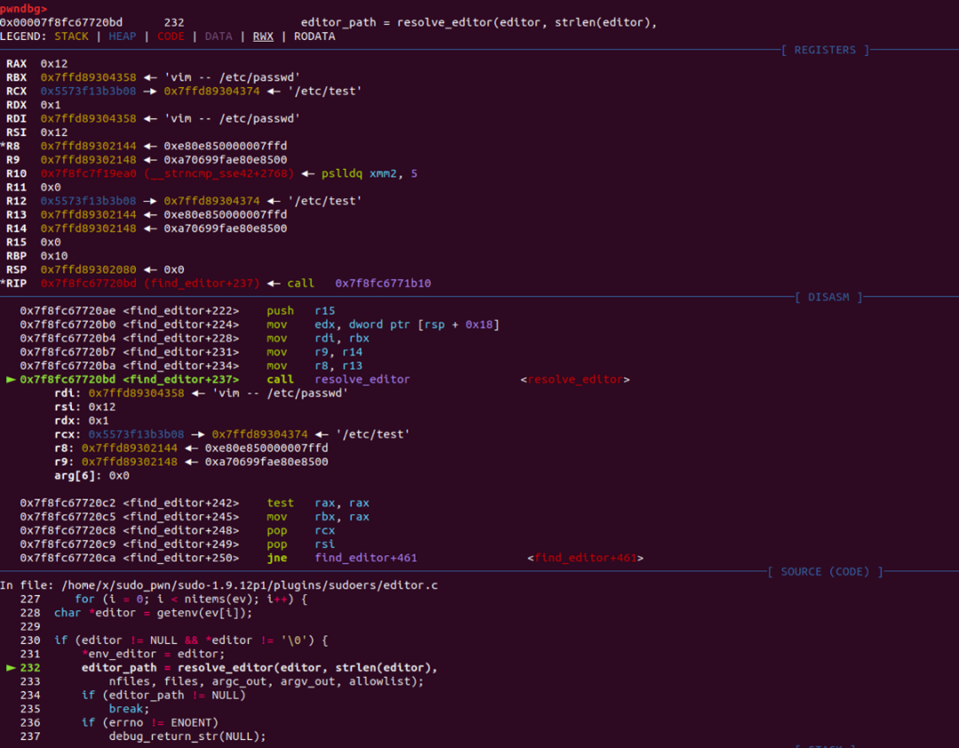 在解析sudoers文件时,该函数将检查用户是否属于允许执行该命令的用户组,以及该命令是否被列入sudoers文件中。如果用户没有权限执行该命令,则该函数将返回false,否则将返回true,并将命令状态存储在cmnd_status变量中。但是在经过了sudoers_lookup函数的检查后,如果以”-e”模式运行,则调用find_editor函数,这个函数会重写已经检查过的命令。这个逻辑是一个很危险的操作,因为一旦经过了权限验证,所执行的命令就不应当被修改。