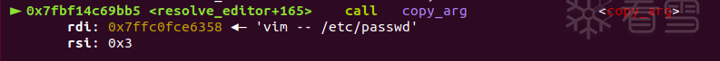 在拷贝结束后会判断要编辑的文件数量是否为0,如果不为0,则程序会往要编辑的文件前注入两个破折号,并且在之后将要编辑的文件名拷贝到nargv数组,这两个破折号相当于标记的作用,标记后面的内容为要编辑的文件名,但此时环境变量是在此之前拷贝的,’vim — /etc/passwd’ 此时已经拷贝到nargv数组中,在此之后拷贝了程序注入的’ — ‘以及文件名,于是这个命令就被解析为vim — /etc/passwd — /etc/test。