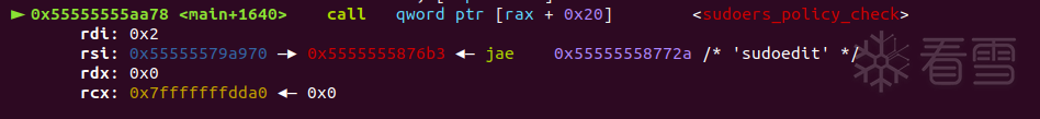可以发现他实际上会通过虚表来调用check_policy,这里虚表的载入实际上是通过load_plugins等函数加载函数表到sudoers_policy结构体中,还与sudoers.so有关,具体过程比较复杂,我们可以直接在gdb里下断点到policy_check函数,然后单步步过到这个位置,然后看一下具体是哪个函数。