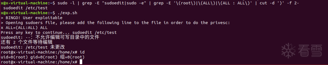 ◆最终,该命令将返回一个以空格分隔的字符串列表,其中每个元素是一个能够以root权限运行的命令参数。如果返回的字符串为空,则表示当前用户无法以root权限运行任意sudoedit命令。