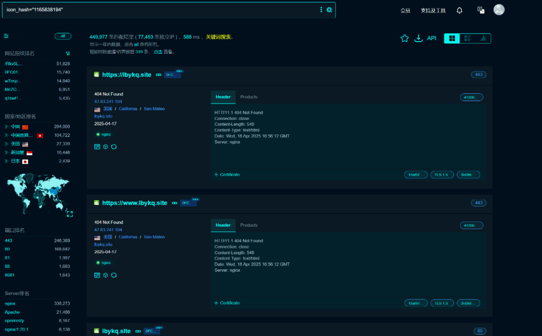 可以看到图标都是一样的,目前 fofa 和 hunter 已经有这种查找的方法了,一般都是把我们的图标换算为我们的 hash 值