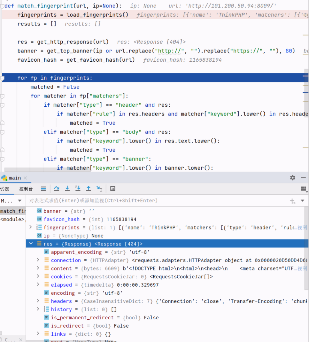 简单看了一下逻辑可以发现和我们的指定方法应该差不多,逻辑就是首先根据 method 去选择方法,一个是 keyword 方法,一个是 faviconhash 方法,是一个大的判断,然乎下面就是根据具体的比如 body,title 等去识别了