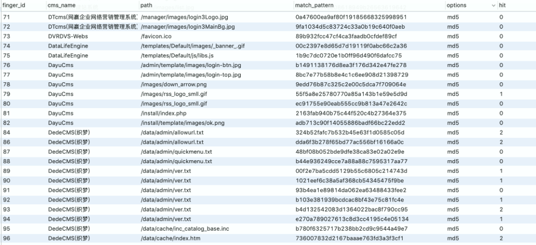 一些网站的特定图片文件、js 文件、CSS 等静态文件,如 favicon.ico、css、logo.ico、js 等文件一般不会修改,通过爬虫对这些文件进行抓取并比对 md5 值,如果和规则库中的 Md5 一致则说明是同一 CMS。这种方式速度比较快,误报率相对低一些,但也不排除有些二次开发的 CMS 会修改这些文件。