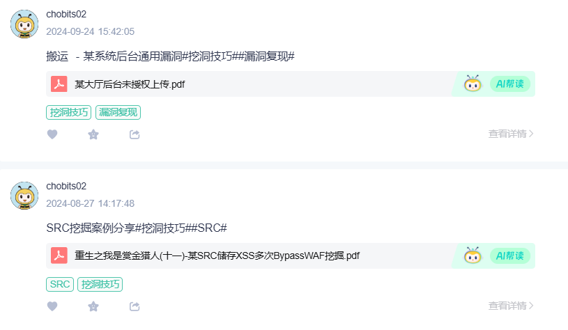 内部资深师傅定期分享真实漏洞挖掘案例,从思路套路到操作步骤,让你可以“照着学、照着做”。